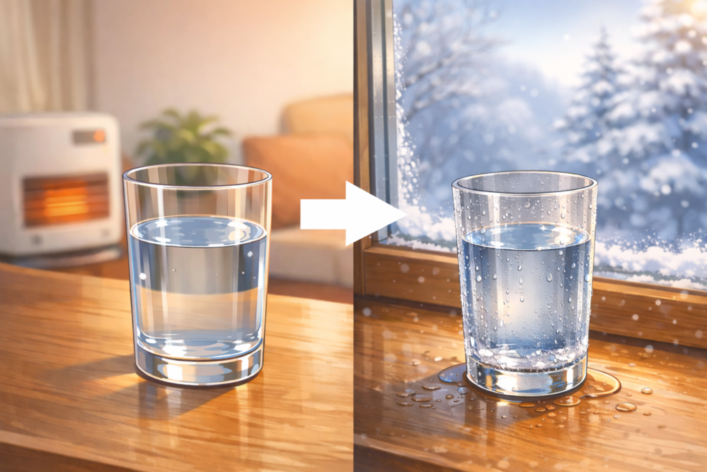 だから寒い冬に部屋の中で暖房をつけると、窓の外は寒いから
